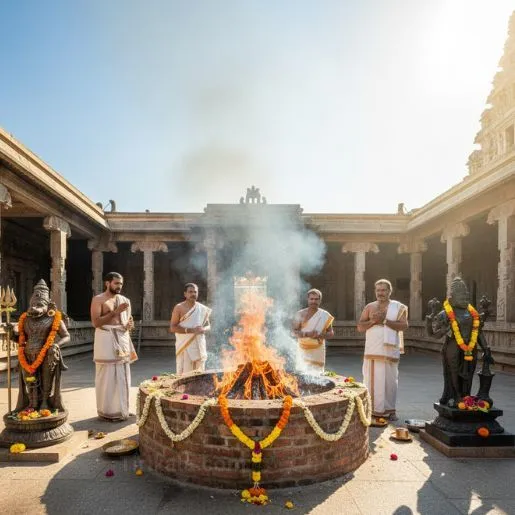 At Tirikala, our Siddha-lineage priests perform this Homam with red flowers, black sesame, ghee, and Bhairava mantras. Your Sankalpam — name, nakshatra, and intent — is offered to align the fire's energy with your need for clarity, courage, and spiritual protection.